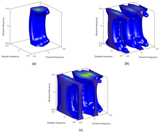 Figure 10 and Figure 11 show the power spectrum distribution of the conventional MIMO, FDA radars and the proposed approach in the horizontal, vertical spatial angular frequencies and Doppler three-dimensional space before the elevation dimension filtering. In order to illustrate the clutter ridge structure, the simulation in the figures shows the clutter power spectrum distribution of a single range cell of three range ambiguous regions. The main slant ranges of the range ambiguous areas are 9 km, 84 km, 159 km, respectively, corresponding to the range unambiguous region, the 1st range ambiguous region, and the 2nd ambiguous region. The spatial power spectra with power greater than or equal to −10 dB and −30 dB are selected for explanation. Observing the three groups of data in Figure 10, we can see that the vertical spatial angular frequency corresponding to the unambiguous region in Figure 10a is fcv0 = 0.3. The corresponding frequencies of the clutters corresponding to the 1st and 2nd range ambiguous regions are fcv1 = 0.1222 and fcv2 = 0.0778, respectively. Since the difference is small, it can be seen from Figure 10a that they overlap each other in spectrum. Figure 10b shows the power spectrum of conventional FDA radar after full angle irradiation or solving the issue of the main lobe moving. Clutter of different regions are separated from each other, and the separation degree is affected by radar parameter ∆f. The elevation dimension filter and the positions of the separated clutter influence the suppression result of range ambiguous clutter. The proposed method, clutter power spectrum, is shown in Figure 10c. As described in the above section, after twice compensation, the spatial angular frequency of unambiguous signal echo composite vertical transmission is the same as that of conventional MIMO. Therefore, the clutter ridge distribution is consistent with that of conventional MIMO. The corresponding vertical spatial angular frequency is fcv0 = 0.3. For range ambiguous areas, the spatial angular frequency of the composite vertical transmission is . Due to the phase term of the range region and pulse number coupling, the clutter echo in the range ambiguous region difficultly forms a clutter ridge with high gain during power spectrum scanning, but is distributed in a wide area with low gain in three-dimensional space. Therefore, the three-dimensional clutter power spectrum is not displayed. Therefore, we distinguish the clutter in the range unambiguous region from the clutter in the range ambiguous region. By observing the −30 dB three-dimensional power spectrum, it can be seen that the display zones of the conventional MIMO radar and FDA radar clutter power spectrum in Figure 11a,b become larger. While in Figure 11c, the clutter in the ambiguous region of the proposed method is irregularly distributed in three-dimensional space. Compared with the first two methods, the clutter energy is dispersed in the whole three-dimensional space and the gain is low.
