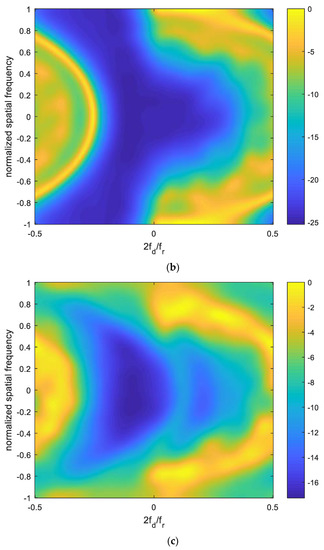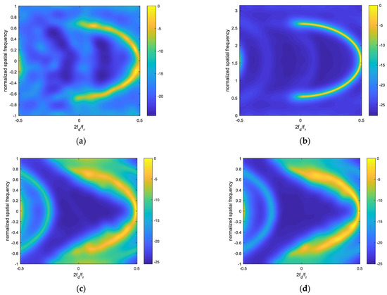 According to Equation (13), the spatial angular frequency of composite vertical transmitting is expressed as . For the desired target located at R0, according to [25,33], and especially Equation (15) of Article [25], we construct the range compensation steering vector: