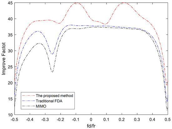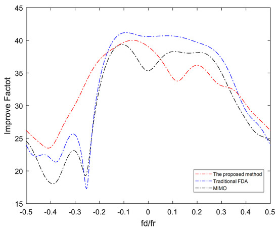 Figure 13 gives us the improvement factor (IF) curves of three approaches at 0° position. The black, blue and red represent the MIMO, FDA and the proposed approach, respectively. Compared with MIMO and FDA radars, it can be seen from Figure 13 that the most serious clutter spreading phenomenon of the power spectrum is MIMO radar, followed by FDA radar. The clutter ridge distribution of the two methods is relatively wide on the Doppler dimension power spectrum. The clutter spreading image of this method is the lightest and the clutter ridge is the narrowest. Meanwhile, the main lobe region of the coherent pulse beampattern can be maintained. The performance of radar target detection is superior.
