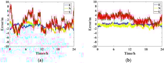 CUT0 one-day BDS/GPS SPP positioning results.(where (a) represents the BDS/GPS SPP positioning error when the observation value is not corrected by TGD, and (b) represents the BDS/GPS SPP positioning error after the observation value is corrected by TGD).