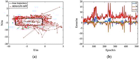 BDS/GPS SPP positioning results (The positioning error is the difference between BDS/GPS SPP and the reference value, which is obtained epoch by epoch). (a) Positioning trajectory. (b) Positioning error.
