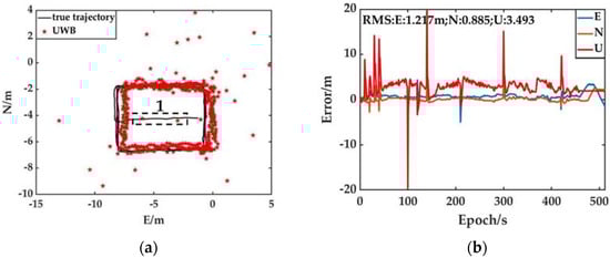 Positioning results of pure UWB. (a) Positioning trajectory. (b) Positioning error.