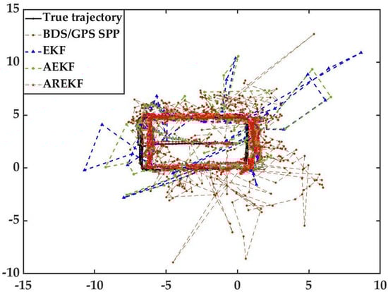 Figure 7 shows the pedestrian positioning trajectory and real trajectory in the transition area under the conditions of each experiment. As can be seen from Figure 7, when conventional EKF is used for BDS/GPS/UWB tightly coupled navigation, the positioning accuracy is improved compared with BDS/GPS SPP, and its trajectory is consistent with the reference trajectory. However, because the conventional EKF cannot adaptively adjust the dynamic model and does not have robust ability in the process of parameter solutions, the positioning bias of the filter in some epochs is too large. The adaptive EKF filter based on the environmental discrimination factor realizes the adaptive adjustment of the dynamic model by evaluating the accuracy of the dynamic model in different environments. Therefore, its positioning accuracy is obviously better than that of the conventional EKF filter. However, as can be seen from Figure 7, whether using conventional EKF or AEKF, when there are gross error factors such as UWB NLOS error in the observed values, there will be obvious bias in the positioning results; the model proposed by this paper realizes the detection and elimination of gross errors in observations by constructing a gross error detection factor on the basis of AEKF and further improves the stability of the algorithm by adding pedestrian motion features. As can be seen from Figure 7, the model in this paper can not only effectively resist the influence of the gross error of the observation value on the positioning results, but it also has the characteristics of high stability, and its positioning trajectory is highly consistent with the reference trajectory.
