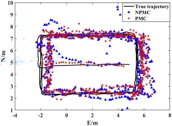 Through further analysis, it is obvious that the observability of UWB at position 1 in Figure 6a is reduced due to the problems of easy interruption of data connection during the data transmission of the UWB equipment. For the fusion positioning algorithm under these circumstances, the quality of the observation value depends on the observation value of the BDS/GPS. However, due to the problems of easy loss of data and the poor accuracy of the observation values in the transition area of the BDS/GPS, the positioning results at this position will deviate. To solve this problem, this algorithm constructs high-precision virtual observations for the fusion positioning system by adding pedestrian motion characteristics constraints, so as to further improve the robustness and universality of the algorithm. (As shown in Figure 8, NPMC (None Pedestrian Motion Characteristics) represents an adaptively robust EKF fusion algorithm without pedestrian motion characteristics constraints, and PMC (Pedestrian Motion Characteristics) represents the adaptively robust EKF fusion algorithm with additional pedestrian motion characteristics constraint information.)