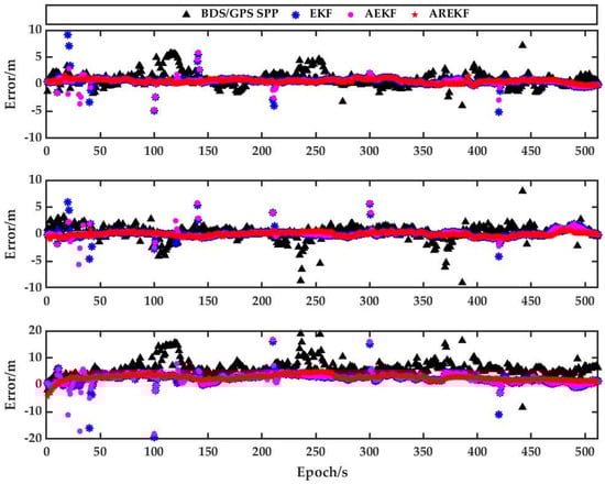 Figure 9 shows that the positioning errors of the trajectory of each scheme in the E, N and U directions are obtained by comparison with the real trajectory. Through the analysis of the positioning residuals, the conclusion is obtained that the BDS/GPS/UWB tightly coupled positioning proposed by this paper has the best positioning accuracy in any direction. The plane positioning accuracy can reach the decimeter level. At the same time, through the further analysis of Figure 9, the following information is available: When the gross error detection and recognition algorithm proposed in this paper is not used, the BDS/GPS/UWB fusion positioning algorithm has obvious outliers (for example, the positioning results of some epochs of EKF and AEKF in Figure 9 deviate significantly from the mean value); the robustness of the positioning system based on this algorithm proposed by this paper has been significantly improved compared with other positioning systems.