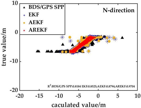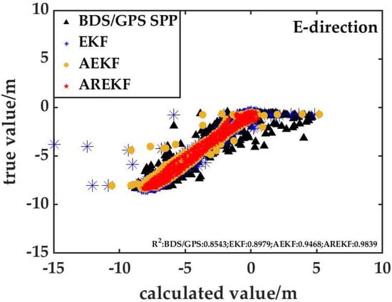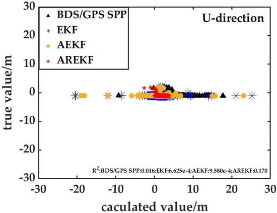 It can be seen from the analysis results (Figure 10, Figure 11 and Figure 12) that the correlation between the BDS/GPS/UWB positioning results based on the proposed algorithm in this paper and the true value is obviously better than the other three positioning algorithms, which also proves the superiority of the algorithm in this paper. At the same time, through further analysis of Figure 12, it can be seen that when pedestrian motion constraints are not attached. Due to the poor positioning accuracy of the BDS/GPS SPP and the UWB algorithms in the U direction, there are many outliers in the U direction of scheme 2 (BDS/GPS/UWB tightly coupled positioning based on EKF) and scheme 3 (BDS/GPS/UWB tightly coupled navigation with an environmental discrimination factor), which make the correlation between the positioning results of scheme 2 and scheme in the U direction and the true value poor. In addition, the true value is lower than that of the BDS/GPS SPP. Through the longitudinal comparative analysis of Figure 10 and Figure 12 or Figure 11, it can be seen that the plane positioning accuracy of each scheme is significantly higher than that in U direction, which is consistent with the results of Figure 9.