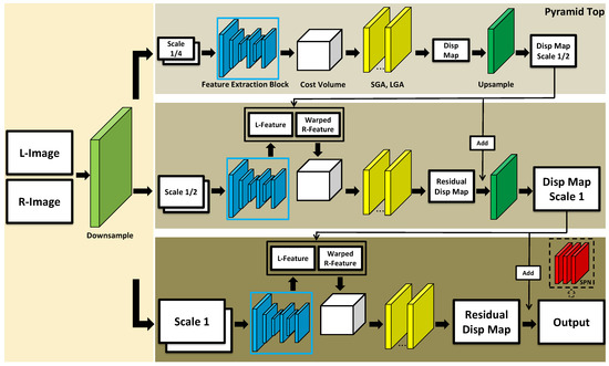 Afterwards, the cost volume enters the cost aggregation block containing SGA and LGA layers, for which the guiding information is obtained from the downscaled master epipolar image. At last, the filtered cost is used for the following disparity regression as GA-Net. Thus, a disparity map of the downsampled image ‘Scale 1/4’ is obtained for the pyramid top. From here, the depth of the scene is already roughly estimated and the large-scale context is perceived, which provides a good guidance for the following processing.