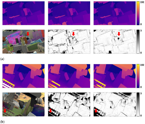 For GA-Net-Pyramid specifically, the number of pyramid levels is 3 and the search range for the disparity residual after the pyramid top is set as [−6, +6] to refine the matching results. Details about the pyramid setting are discussed in Section 4.2.3. We apply 3 SGA and 2 LGA layers to regularize the cost volume on our pyramid top, which is the same as GA-Net. With regard to the other pyramid levels, only 1 SGA layer (with 2 LGA layers) is utilized due to the small disparity search range. The weight is set as 0.25, 0.5, and 1, to the pyramid level 1 (top), 2 and 3 (bottom), respectively, to calculate the final loss in Equation (7). The implementation of the methods is based on Python and Pytorch.