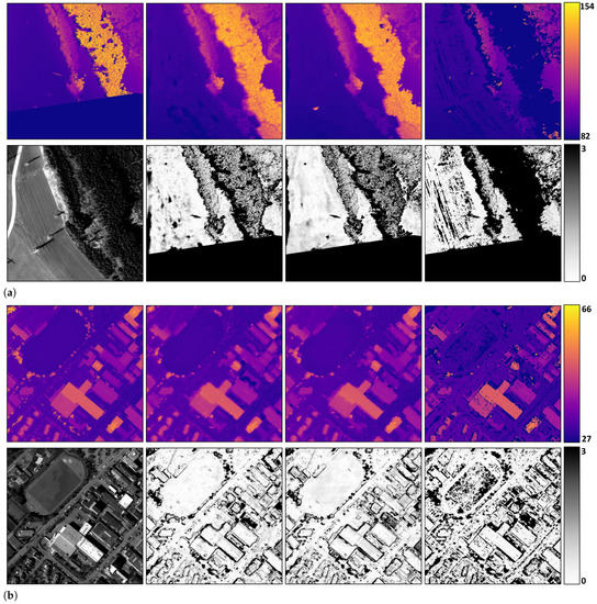 In this section, the networks are tested using our aerial data. The airborne and satellite (discussed in the following section) stereo processing is the target domain of this research, since the corresponding data are usually large in size and own a much wider stereo baseline, which presents a higher demand on the algorithm’s efficiency. The networks are trained on synthetic remote sensing data (854 stereo pairs) from scratch for 200 epochs, then finetuned on a subset (200 stereo pairs) of our aerial data for 100 epochs (data details are in Section 4.2.1). We randomly select another 20 aerial stereo pairs, possessing no overlap with the finetuning data, to test the trained models. Image patches in size of 384 × 576 are randomly cropped for training, and the test images are 1152 × 1152. The data may contain negative or very large disparity values; hence, we exclude the stereo pairs with large baselines in order to keep the disparity range processible by both GA-Net-Pyramid and GA-Net. Accordingly, the disparity range is also set as [0, 192]. The models are trained with a batch size of two on two Quadro P6000 GPU cards.