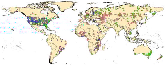 We compiled and curated a dataset of 15,259 SWCCs (Figure 1) called the Global Soil Hydraulic Properties (GSHP) database []. This dataset is much larger than the training datasets used for two frequently applied PTFs, i.e., Rosetta 3 [] and HiHydroSoil v2.0 [] that is based on the PTF of Tóth et al. []. Rosetta 3 used 2134 SWCCs (mainly from North America and Europe) whereas HiHydroSoil v2.0 used 3773 SWCCs from Europe to develop the respective PTFs. Hence, maps of vG parameters deduced from Rosetta 3 or related to HiHydoSoil v2.0 have been calibrated by a rather limited dataset of SWCCs, and this motivated us to collect a more comprehensive dataset. We collected SWCC data from 2702 locations that represent all continents and climatic regions. The geographic and climatic distribution of locations with SWCC data was uneven, with most SWCCs measured in North America, followed by Africa, Europe, Asia, South America, and Australia/Oceania. Additionally, the majority of SWCCs (10,048 out of 15,259 curves) were obtained in temperate regions, and 2344, 1422, 1411, and 34 SWCCs were obtained from boreal, tropical, arid, and polar regions, respectively.