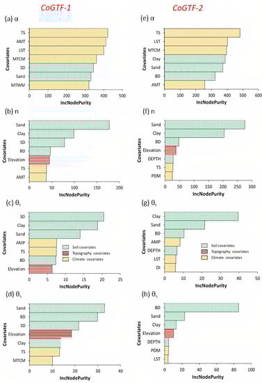 Figure 2 lists the most important covariates for vG parameter modeling. The figure shows that the covariate importance differed between the various vG parameters (some parameters were dominated by climate covariates, others by soil properties) but was rather similar for CoGTF-1, and CoGTF-2. Climate covariates were the most important factors for the inverse air entry pressure parameter (Figure 2a,e) whereas sand and clay were the key covariates for the shape parameter n (Figure 2b,f). In addition, for residual (Figure 2c,g) and saturated water content (Figure 2d,h), soil covariates were the dominant factors (soil depth and clay content for residual and sand and bulk density for saturated water content).