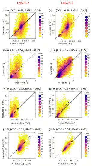 The results of SCV for both models CoGTF-1 and CoGTF-2 are presented by hexbin density plots in Figure 3. For parameters , the line of LOWESS fell close to the 1:1 line, hence predictions were approximately conditionally unbiased for both models. However, for and the LOWESS lines were unbiased up to approximately 0.15 and 0.60 m3/m3, respectively, but slightly biased for higher water content. SCV of CoGTF-1 showed concordance correlation coefficients (CCC) for (unit of m−1), n, , and of 0.432, 0.525, 0.321, and 0.565, respectively, and coefficients of determination () of 0.273, 0.325, 0.172, and 0.412, respectively. The root mean square errors (RMSE) for the four parameters were equal to 0.442, 0.888, 0.076, and 0.082, respectively, and the BIASes equal to 0.008, 0.050, −0.001, and 0.001, respectively.
