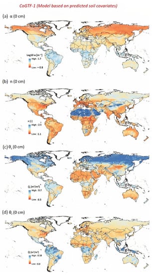 Global maps of van Genuchten parameter at the soil surface (marked as ‘0 cm’) calculated with CoGTF-1 model based on predicted soil covariates. The maps (a) show inverse air entry pressure parameter (unit of m−1),), (b) shape parameter n, (c) the residual water content , and (d) the saturated water content . The parameter n is high for sandy soils. Predictably, is affected by soil bulk density map (high values in high latitudes dominated by organic soils with low bulk density). In contrast, the parameter shows low values in these northern latitudes (large pores and low capillarity).