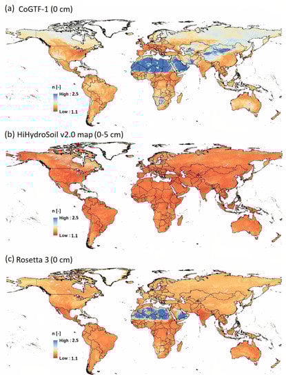 Visual comparison of global maps of shape parameter n between (a) CoGTF-1 (based on predicted soil covariates), (b) HiHydroSoil v2.0, and (c) Rosetta 3. Large values are shown for regions with high sand content for CoGTF-1 and Rosetta 3. In contrast to Rosetta 3, large n values were predicted as well by CoGTF-1 for cold regions with high bulk densities. The values from HiHydroSoil v2.0 map were consistently small in all regions.