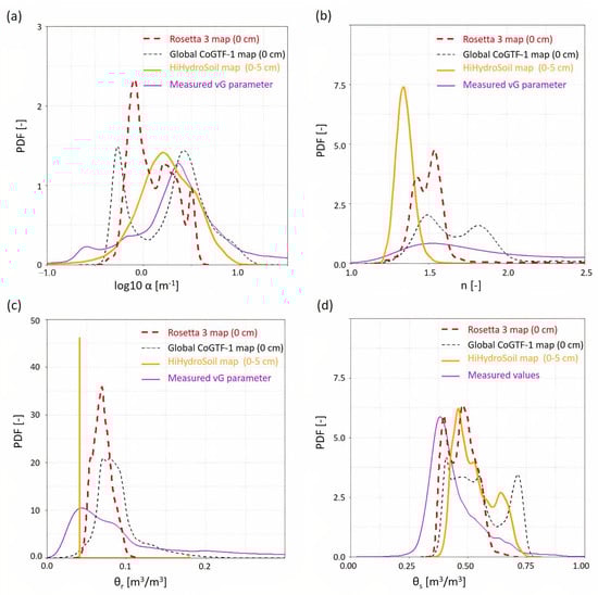 Probability density functions (PDF) of vG parameters for the CoGTF-1 map (black), Rosetta 3 map (red), HiHydroSoil v2.0 map (orange), and of the ‘measured’ values of 11,705 SWCC from GSHP dataset. The plots (a) show inverse air entry pressure parameter (unit of m−1),), (b) shape parameter n, (c) the residual water content , and (d) the saturated water content . Note that the HiHydroSoil v02.0 map reported only 2 distinct values for with 0.04 m3/m3 if sand content was larger than 2% and 0.17 m3/m3 if sand content was below 2% (only very few locations).