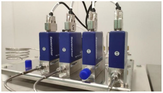 The atmosphere simulation system consists of a gas filling and mixing unit and a quadrupole mass spectrometer. The gas filling and mixing is implemented by a gas injection pipeline including four parallel channels, meaning that up to four different kinds of gases can be injected into the cabin simultaneously and mixed in the cabin subsequently. Note that the gas injection pipeline itself would be pumped to high vacuum by the magnetic suspension molecular pump before the gas filling. The injection rate of each gas can be manipulated by a mass flowmeter, as demonstrated in Figure 5, hence the desired gas component proportion can be achieved.