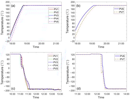 The mean and standard deviation of the seven PVs have been calculated to evaluate the accuracy of the temperature measurement. For the high temperature limit (180 °C), we chose the real-time PVs (at 21:16:23) when the temperature was at a stable level to perform the calculation. The mean is 180.1 °C and the standard deviation is 0.3 °C, indicating a very good accuracy of the cabin temperature measurement. For the low temperature limit (−190 °C), a similar strategy was adopted (at 13:32:53). The mean is −189.9 °C and the standard deviation is 3.2 °C, also indicating a good accuracy of the temperature measurement.