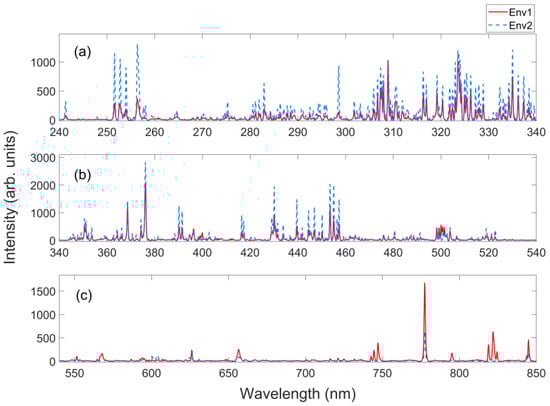 The LIBS spectra collected in the two environments are illustrated in Figure 9. The ordinary laboratory environment is denoted as environment 1 (Env1) and the spectra are presented by red lines, while the simulated Martian environment is denoted as environment 2 (Env2) and the spectra are indicated by blue dashed lines. The displayed spectra underwent the preprocessing steps described in Section 5.1.