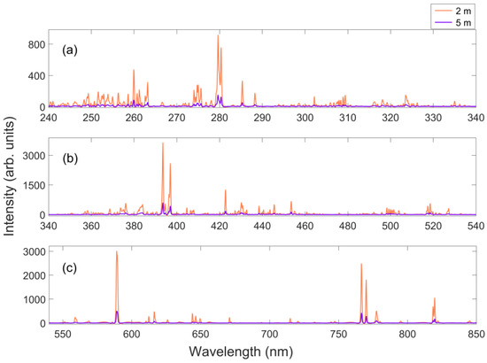 The LIBS spectra collected from the basalt reference sample at the two distances, in the ordinary laboratory environment. The orange lines denote the result for 2 m and the purple lines for 5 m. (a) The spectra in Channel 1. (b) The spectra in Channel 2. (c) The spectra in Channel 3.