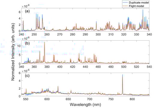 Before the flight of the MarSCoDe instrument in 2020, we had collected quite a few LIBS spectra on the Ti alloy calibration standard in a simulated Martian environment (in 2019). In order to compare the performance of the MarSCoDe and its laboratory model, we reproduced the simulated environment with this platform, and collected LIBS spectra on the duplicate Ti alloy sample by MarSCoDe laboratory model. The simulated Martian environment herein and that in the pre-flight experiment have the same parameters as those described in Section 5.2. The detection distance is 3 m, identical to the distance in the pre-flight experiment. The spectra collected from MarSCoDe and its duplicate model are illustrated in Figure 11, and the results are also after preprocessing procedures. In addition to dark subtraction, wavelength drift correction, and wavelength calibration, the preprocessing herein also includes radiometric calibration and spectral normalization (normalized by the sum of the spectral intensities for each channel).