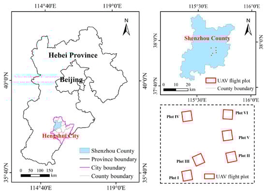 The study area is located in Shenzhou County (37.71°~38.16°N, 115.36°~115.80°E), Hengshui City, Hebei Province, China, in the main grain-producing region of the North China Plain. The main planted crops in the region are winter wheat and summer corn. Winter wheat is one of the most important summer harvest crops in this area. The region has a warm, temperate, semiarid, monsoon climate with an average annual temperature of approximately 13.4 °C and an average annual precipitation of approximately 480 mm. The planting time of winter wheat in the study area is in early to mid-October, the reviving stage is in early to mid-March of the next year, the jointing stage is from late March to early to mid-April, the heading-flowering period is from late April to early May, the grain filling stage is from mid-May to late May and the maturity stage is in early June. The specific location of the study area is shown in Figure 1.