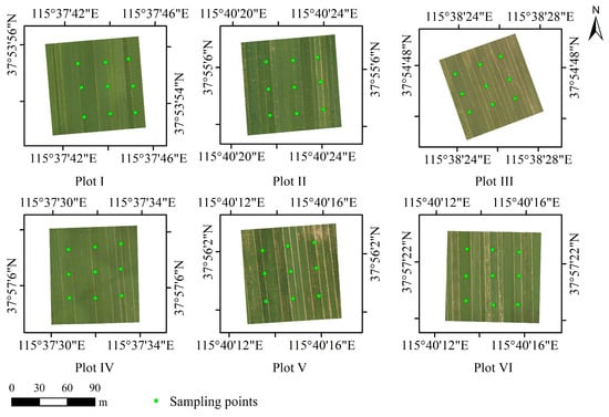 UAV remote sensing data acquisition was mainly carried out in Yuke Town and Hujiachi Town of Shenzhou County. After the field investigation of winter wheat distribution and crop growth conditions in the study area, six representative plots were selected as the experimental area for UAV remote sensing data acquisition. Each UAV flight plot was an approximate 100 m × 100 m square, with an area of approximately 1 hectare (10,000 m2). The six plots were sequentially numbered Plot I, Plot II, Plot III, Plot IV, Plot V and Plot VI. In this study, three UAV flight experiments were conducted on 3 May 2021 (flowering period), 25 May 2021 (filling period) and 4 June 2021 (maturity period). At the same time, the aboveground biomass and grain yield data of winter wheat were obtained on the ground. The UAV flight experimental plots and ground sampling points are shown in Figure 1 and Figure 2.