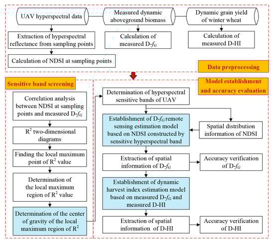 The main process in this study included three parts. The first part was the acquisition and preprocessing of the UAV remote sensing data and ground observation data, as well as the calculation of relevant parameters, such as the NDSI, measured D-fG and measured D-HI, at sampling points. The second part was mainly to determine the sensitive band centers for the D-fG remote sensing estimation. Specifically, the correlation between the NDSI and measured D-fG at sampling points was determined, and a two-dimensional map of fit accuracy (R2) between the NDSI and the D-fG of winter wheat was obtained; then, the sensitive band centers for winter wheat D-fG estimation were identified by determining the local maximum region of R2 and its center of gravity. The third part was the estimation and verification of the D-HI based on the D-fG parameters obtained from UAV remote sensing data. First, after determining the sensitive band centers for winter wheat D-fG estimation, the corresponding NDSI was constructed by using the reflectivity of the sensitive band of the UAV hyperspectral image, the winter wheat D-fG estimation model was completed and spatial information extraction and accuracy verification of the D-fG parameters were performed. Then, the D-HI estimation model was established based on the measured D-fG and measured D-HI values. Finally, based on the D-fG remote sensing information obtained, spatial information on the D-HI of winter wheat was extracted based on the UAV hyperspectral image and the accuracy was verified. The details of the entire procedure are shown in Figure 3.