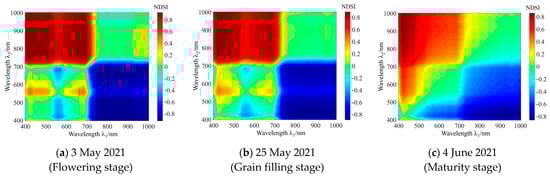 In the study, with the UAV hyperspectral reflectance data corresponding to each field sampling point, according to Formula (2), the NDSI of the field sampling points in each plot was calculated and graphed using MATLAB software and the NDSI distribution of winter wheat was obtained. There were 150 × 150 combinations of spectral bands and related NDSI values between any two bands in the 400~1000 nm hyperspectral range. Due to space limitations, only the UAV hyperspectral NDSI calculation results for different growth periods (including the flowering stage, filling stage and maturity stage of winter wheat) at a sampling point (37°53′55″N, 115°37′43″E) in Plot I are shown, and the specific results are shown in Figure 4. The abscissa (λ1) and ordinate (λ2) are both hyperspectral wavelengths in the range of 400~1000 nm. The points corresponding to the two-dimensional space formed by the horizontal and vertical axes are the NDSI(λ1, λ2) values calculated by the corresponding reflectance of any two bands λ1 and λ2.