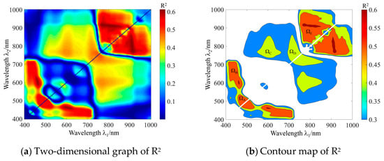 MATLAB software was used to analyze the correlation between the D-fG and the NDSI constructed by any two bands of the UAV hyperspectral spectrum. Finally, a two-dimensional diagram of the fit accuracy (R2) of the NDSI and the D-fG was obtained, as shown in Figure 5a. The horizontal and vertical axes constitute a total of 150 × 150 points corresponding to the R2 two-dimensional space, with each point representing the R2 value between the corresponding NDSI value and measured D-fG. Figure 5a shows that R2 is axisymmetric with a connecting line between (400, 400) and (1000, 1000), from which the region and relevant band information with an obvious correlation between the NDSI and the D-fG can be obtained. On this basis, the centers of the sensitive hyperspectral band for the D-fG estimation could be determined. In this paper, only the area on the upper side of the symmetry axis in the R2 two-dimensional graph was studied.