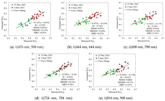 Based on the 5 pairs of selected sensitive hyperspectral band centers, namely, λ(476 nm, 508 nm), λ(444 nm, 644 nm), λ(608 nm, 788 nm), λ(724 nm, 784 nm) and λ(816 nm, 908 nm), the sensitive UAV hyperspectral bands for the D-fG estimation were determined, and the NDSI of the six plots in the grain filling period and maturity period were calculated according to Formula (2) with the different sensitive band centers. Then, according to Formula (5), the linear models of the NDSI and the D-fG based on different sensitive band centers were constructed, the D-fG spatial estimation results of six plots in the grain filling stage and maturity stage were obtained based on different sensitive band centers, and the verification data set (N = 36) was used for D-fG accuracy verification. Finally, based on the centers of the sensitive bands, the statistical relationship between the D-fG and the NDSI and the estimation accuracy of the D-fG were obtained. The specific results are shown in Table 2 and Figure 6.