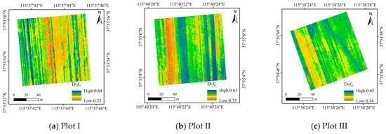 Due to space limitations, only the UAV hyperspectral NDSI result and estimated D-fG values with the highest estimation accuracy, which correspond to the sensitive band centers λ(724 nm, 784 nm), are shown in this paper. The NDSI values calculated for Plots I-VI in the grain filling period and maturity period are shown in Figure 7 and Figure 8, and the D-fG remote sensing estimates in the grain filling period and maturity period are shown in Figure 9 and Figure 10, respectively. According to the analysis of six plots, the NDSI during the grain filling period ranged from 0.29 to 0.70, and the average NDSI value in the study area was approximately 0.47. The NDSI at the maturity stage ranged from 0.08 to 0.53, and the average NDSI value in the study area was approximately 0.27. The estimates of the D-fG during the grain filling period were between 0.21 and 0.50, and the average value of the D-fG in the study area was approximately 0.37; the estimates of the D-fG at the maturity stage were between 0.32 and 0.65, and the average value of the D-fG in the study area was approximately 0.51. The statistical information of the NDSI and the D-fG in each plot is shown in Table 3.