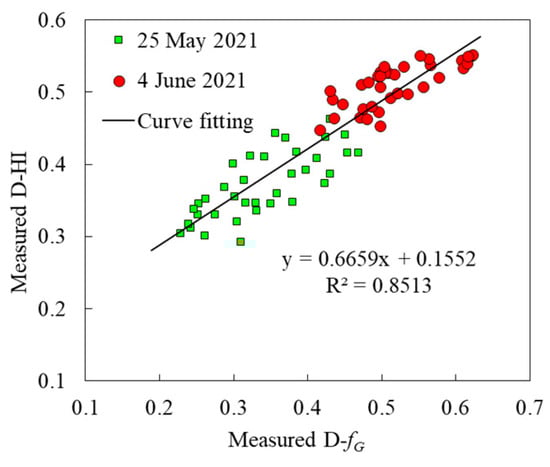 Based on the crop HI estimation method including fG in the maturity period, which was proposed by Kemanian et al. [16], a UAV remote sensing-based method for estimating the D-HI with the D-fG information was proposed in this study. The statistical model between the D-fG and the D-HI is shown in Formula (6).