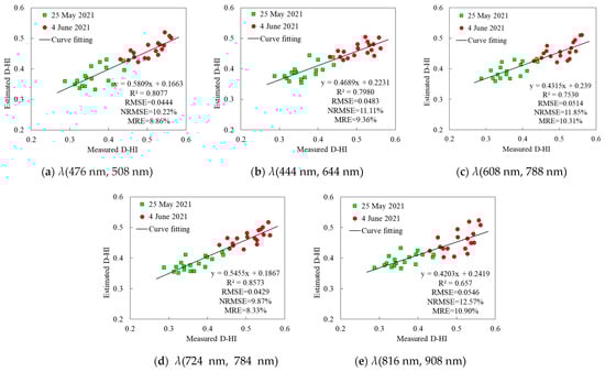 The overall evaluation accuracy results for the D-HI estimation in Table 4 show that when five pairs of selected sensitive hyperspectral band centers were used, the spatial D-HI estimates, based on the D-fG parameters obtained from the sensitive UAV hyperspectral bands, were accurate. The fit accuracy R2 was between 0.6570 and 0.8573, the RMSE was between 0.0429 and 0.0546, the NRMSE was between 9.87% and 12.57% and the MRE was between 8.33% and 10.90%. Moreover, based on sensitive hyperspectral band centers λ(724 nm, 784 nm), the accuracy of the spatial D-HI estimation results was the highest, with an RMSE, NRMSE and MRE of 0.0429, 9.87% and 8.33%, respectively; based on hyperspectral sensitive band centers λ(816 nm, 908 nm), the accuracy of the spatial D-HI estimation results was relatively low, with an RMSE, NRMSE and MRE of 0.0546, 12.57% and 10.90%, respectively.