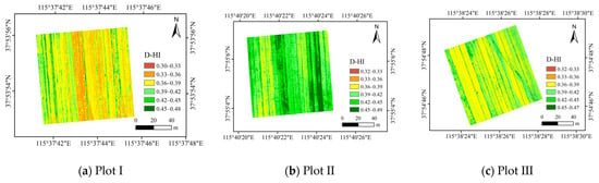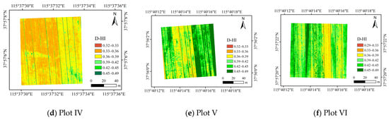 Due to space limitations, this paper only shows the D-HI estimation results for Plots I-VI with the highest estimation accuracy, corresponding to the sensitive band centers λ(724 nm, 784 nm) in the grain filling period and maturity period (Figure 13 and Figure 14). The estimates of the D-HI during the grain filling period were between 0.29 and 0.49 among the six plots and the average D-HI in the study area was approximately 0.40. The estimates of the D-HI during the maturity period were between 0.37 and 0.59 and the average value of the D-HI in the study area was 0.49. The statistical results for the D-HI during the grain filling period and maturity period in each plot are shown in Table 5.