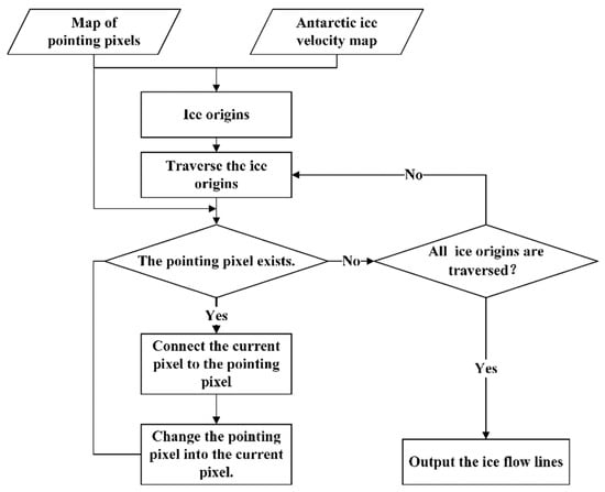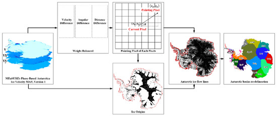 In this paper, we propose a weight-balance-based method for extracting ice flow lines using an Antarctic ice flow velocity map. First, three features that determine the position of the pointing pixel are obtained, namely, the angular difference, the distance difference and velocity difference, to represent the directional accuracy, the smoothness, and the physical character, respectively. The weight-balanced method was applied to those influencing factors by weighting. Then, we use the pointing-pixel map combined with the flow velocity map to determine the ice origins. Finally, a complete ice flow line is obtained from the ice origins and the pointing pixel map. The flowchart is shown in Figure 1, and we will describe it in more detail in the following sections.