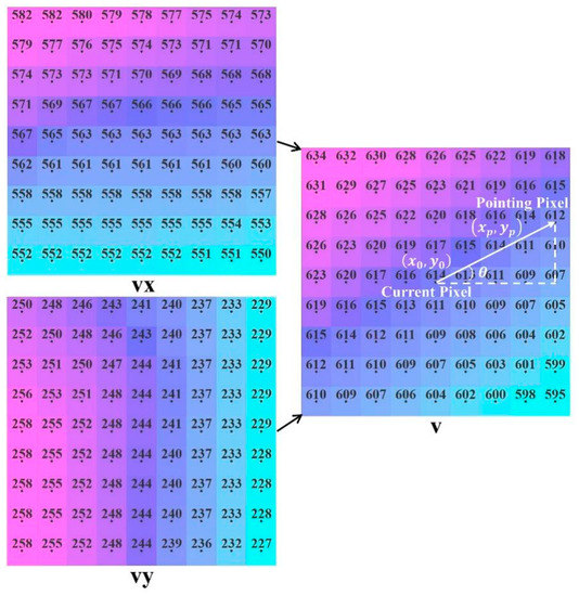 We set the position of the current pixel as , the position of the neighborhood pixel as , and the position of the pointing pixel as , as shown in Figure 2.