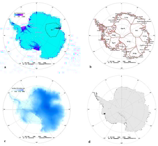 - Ze, Y.; Zhizhong, K. Data from:Antarctic Drainage Basins Delineation; Science Data Bank: Beijing, China, 2022. [Google Scholar] [CrossRef]