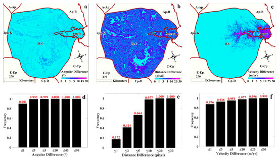 Figure 5 shows the distribution of the angular, distance, and velocity differences of the pointing pixels in the B-C basin and the fringing Amery ice shelf (Figure 5a–c), as well as the corresponding cumulative frequency distribution histograms (Figure 5d–f). As shown in Figure 5d, over 90% of the pixels suggest an angular difference of less than (nearly 100% ). Similarly, for distance differences, as shown in Figure 5e, over 95% of the pixel distance differences are less than 10 pixels. Furthermore, for the flow velocity difference (Figure 5f), nearly 90% of the pixels exhibit a flow velocity difference of less than 1 m/yr. Therefore, we can conclude that for most of the B-C basin and its fringing Amery ice shelf, our result indicates a high directional consistency, a high smoothness, and identical physical characteristics. At the same time, considering the spatial distribution of these three impact factors (as shown in Figure 5a–c), we also find that the minimum angular difference, minimum distance difference, and minimum velocity difference are often not satisfied simultaneously. Consequently, the position of the pointing pixel is not determined by a single impact factor, which further verifies the validity of the proposed weight balance-based method.