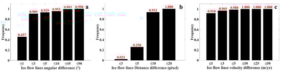 Furthermore, as can be seen from the Table 1, the maximum values of angular difference, distance difference and flow velocity difference for ice flow lines are less than 5° (for more than 90% of flow lines), less than 10 pixels (for more than 75% of flow lines) and less than 1 m/yr (for more than 90% of flow lines).