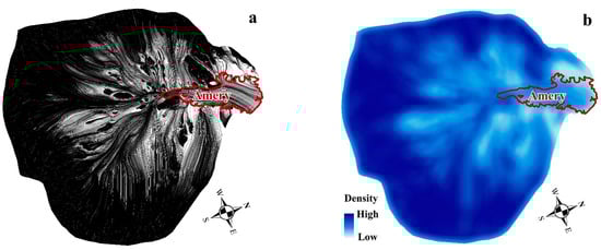 Ice flow lines and its density of B-C basin and its fringing Amery ice shelf (no thinning of ice flow lines). (a) Ice flow lines. (b) Density of ice flow lines.