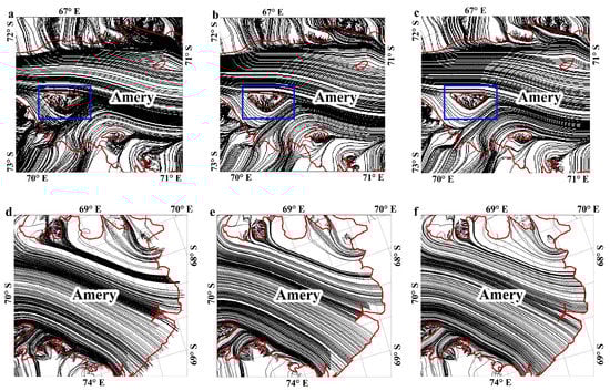 Comparisons of ice flow line extraction result on the partial Amery ice shelf. The black lines denote the derived ice flow lines, the red lines denote the boundaries of Amery ice shelf. (a) Method only considering angular difference (case #1). (b) Weight-balance-based method considering angular difference and distance difference (case #1). (c) Proposed method (case #1). (d) Method only considering angular difference (case #2). (e) Weight-balance-based method considering angular difference and distance difference (case #2). (f) Proposed method (case #2).