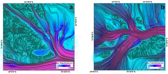 We truly appreciate the National Snow and Ice Data Center (https://nsidc.org/data, accessed on 7 March 2021) for providing the Antarctic ice velocity map, Antarctic Boundaries products and MODIS Mosaic of Antarctica Image Map products. We also greatly thank British Antarctic Survey (https://www.bas.ac.uk, accessed on 7 March 2021) for providing the Bedmap2 products and the US Geological Survey Earth Resources Observation Science Center for providing Landsat imagery.