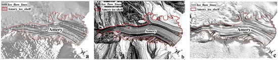 Flow-parallel features are among the most dominant characteristics of Antarctic ice sheet surfaces [1,2,3]. They originate from the ice sheet interior and continue into its fringing ice shelves [4,5,6], often even extending hundreds of kilometers in length [5,7]. In the glaciological literature, these flow-parallel features are commonly referred to as “longitudinal surface structures”, “flow lines”, “flow stripes”, “flow bands”, or “streak lines” [5,6,8,9,10,11,12,13]. The mapping and distribution of these ice flow lines reveals widespread, complex ice flow configurations covering entire Antarctic ice sheet surfaces, which would provide reliable evidence for the deciphering and tracking potential ice origins. By continuing to track the ice origin of these flow lines—the analysis of their genesis and evolution—researchers are aided in developing an in-depth understanding of their glaciological importance [5,7].
