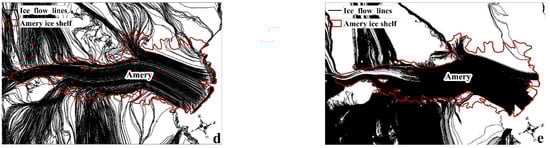 After that, we calculate and count the total length of each ice flow line in the B-C basin and its fringing Amery ice shelf by accumulating the distances between two consecutive points along the query ice flow line. In the B-C basin, the total number of derived ice flow lines is 1306861, with a tracking capacity of 1589.540 km from their ice origins. As shown in Figure 7a, longer ice flow line lengths mainly flowed through the Amery Ice Shelf, while shorter lengths were mainly found in the interior of the ice sheet and on islands or bare rock outcrops, which is consistent with the findings of previous studies [35].