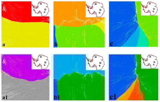 Parts of detailed comparisons at the boundary of the basins between IMBIE basin systems and re-divided Antarctica basin systems. The ice flow lines belonging to different basins are rendered in different colors, where the first row (a–c) is the IMBIE basin systems and the second row (a1–c1) is the corresponding re-divided Antarctica basin systems.