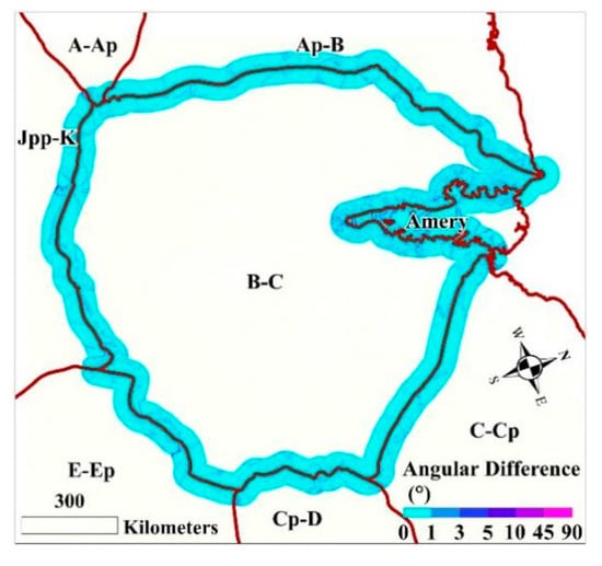 To measure the accuracy of the basin delineation results, we utilize the directional accuracy map of the proposed method, which is consistent with the resolution of the Antarctic ice flow line map. Meanwhile, directional accuracy is an essential factor for the extraction of ice flow lines. In addition, the direction of flow velocity directly determines the direction of local ice flow movement. Therefore, if the directional accuracy of the flow lines is high around the boundary lines of the redefined basins, it can be inferred that the difference between the direction of the flow lines and the direction of the flow velocity of the local ice streams in these areas is small. We take the boundary line of ice basin B-C and its fringing Amery ice shelf as the centerline to draw a buffer zone with a width of 100 km and extract the distribution of the directional accuracy obtained by the method in this paper within the range of the buffer zone. Figure 14 shows that almost all areas have an orientation accuracy of less than 1°. As listed in Table 4, more than 90% of the regions have a directional accuracy less than 1°, and more than 98% of the regions have a directional accuracy less than 3°. In addition, the mean value of these data is 0.446°, and the standard deviation is 1.181°. Thus, the ice basin delineation results are reasonable and reliable.