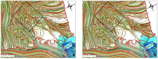 The Antarctic ice shelf system is an important area connecting the ice sheets and the ocean. Its stability is closely related to the Antarctic mass balance [49]. For the B-C basin where the major calving event occurred in July 2019 [50], the ice flow lines in the Amery ice shelf area are randomly rendered in different colors and overlaid with a Landsat 8 image collected on 14 October 2019. Based on the Antarctic IMBIE basin systems, the calving area (blue polygon in Figure 15) is delineated to the AP-B basin using the ice flow line tracing algorithm. Nevertheless, the calving area actually belongs to the B-C basin [50]. Therefore, the original basin delineation is not reasonable since the black box in Figure 15a shows the area where the ice origins are concentrated within the calving area of the Amery ice shelf. In contrast, the calving area is accurately estimated from the re-delineation of Antarctic basin systems (as shown in Figure 15b). Obviously, the re-delineation of Antarctic basin systems operates in favor of mass balance, glacier genesis and evolution.