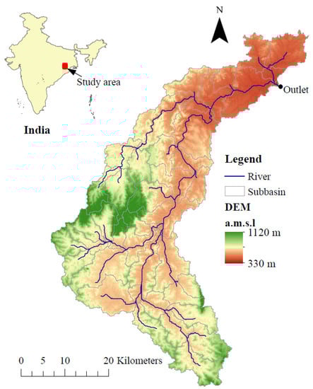 The Upper Baitarani catchment is in India with an area of about 1711 km2 (Figure 1). The digital elevation model (DEM) from the Shuttle Radar Topography Mission shows that the elevation of the catchment varies in a wide range, from 330 to 1120 m above mean sea level (a.m.s.l). Despite the study area covering a relatively large area with high variation in topography, there is only one weather station located in the area. Observed rainfall shows an average annual rainfall of 1165 mm with high temporal variation and out of which more than 80% of the rainfall occurs between June and October. The average monthly minimum and maximum temperature in the area are 11 °C and 34 °C, respectively. The dominant land uses/land covers in the area are agricultural, forest, and range grass, accounting for about 36%, 32%, and 25% of the study area, respectively. The dominant soil type in the area is sandy clay loam with low water holding capacity [32]. The observed weather data were procured from the India Meteorological Centre, Bhubaneswar, India. Furthermore, sunshine hours were used for calculating the solar radiation data for the considered catchment.