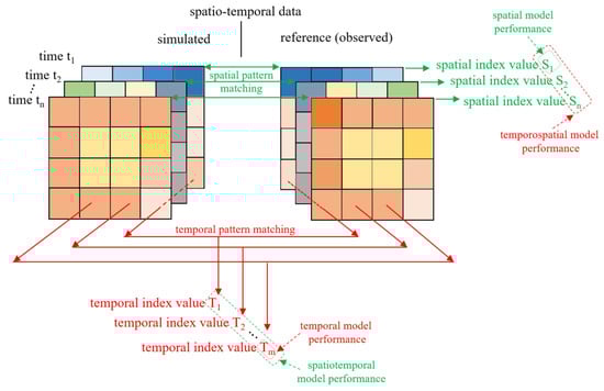 Evaluation of the spatial and temporal performance is the assessment of the simulated spatiotemporal data against the reference (or observed) spatiotemporal data. Here, the model output data that need to be evaluated are time-series data at every pixel (with an equal area) of the modeling domain (Figure 2).