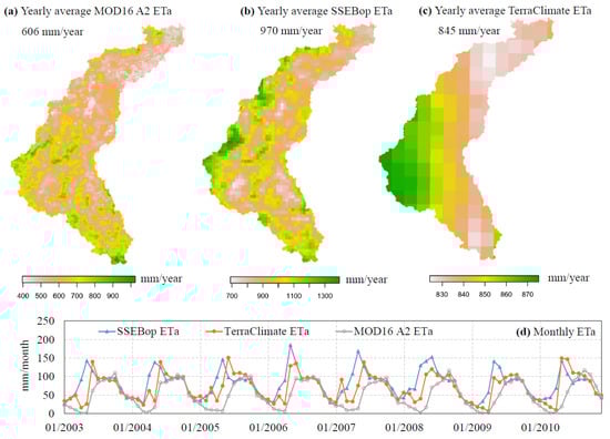 (a–c) Spatial and (d) temporal variations of ETa from MOD16 A2, SSEBop, and TerraClimate in the study area during the period from 2003 to 2010.